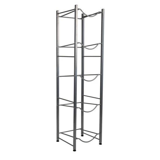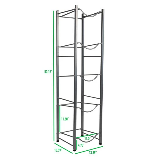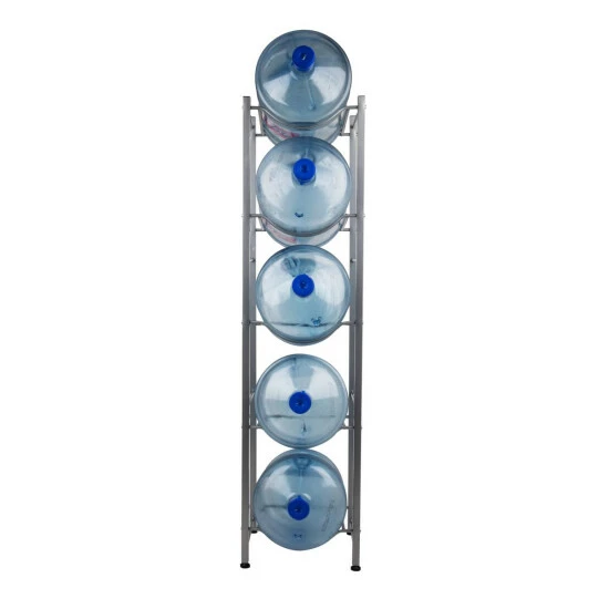 The Mind Reader Heavy Duty Water Cooler Jug Holder is a premium metal engineered storage rack that keeps your water secure.Its sturdy frame is fashioned our of high-quality metal that fortifies your 5-gallon water jugs and keeps them firmly locked into place within a dense metal frame. This 5-gallon water jug storage rack can be easily unboxed, set up, and ready to store your water without hassle or mess. It also comes installed with four rubber floor grips, one on each foot, protecting your floors from scratching and preventing your water jugs from sliding off and damaging your office space or home.This Heavy Duty Water Cooler Jug Holder also provides you with the option to place your jugs on every tier of this water rack forwards or backward facing. Its modular water bottle rack design allows you to simply adjust the feet to provide the best height for storage in any room and ceiling, while also maintaining a comfortable reach for your coworkers or family.We know that you take your office, kitchen, or breakroom space seriously. Everything should be placed and oriented to maximize space. Thatβs why this water gallon rack stands tall, holding up to 5 jugs in one convenient spot, saving you space and keeping your everyday access to water organized and ready.