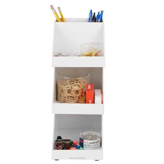 Save space and contain clutter in the break room, hospitality area, coffee station and anywhere else you need to organize with a MindReader multi-level condiment station. Designed to perfectly fit stir sticks, condiments, single serve coffee pods and tea bags in a variety of sizes, this organizer can hold a variety of items in its various, easily accessible sections. Use it to stack and sort your sugar, creamer, coffee pods, tea bags and other serving essentials anywhere beverages are being served.This condiment organizer is constructed from durable, lightweight stainless steel, making it easy to move around as needed. Integrated rubber feet grip your countertop or table to prevent it from sliding or skidding, even if thereβs a spill.