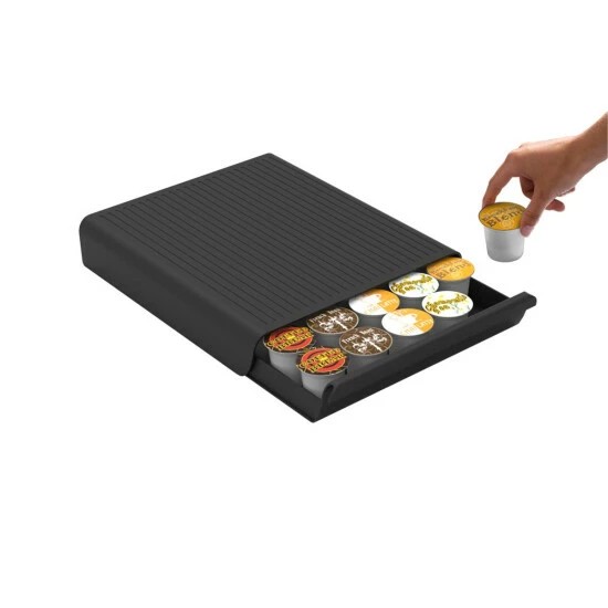 Place your single serve coffee machine on top of this storage drawer to save valuable counter space. Quality sliding drawer construction, and bottom rubber grippers keep the unit in place. The clean and modern design is perfect for home or office. Holds 30 K-Cup Single Serve Coffee Pods, or 35 CBTL/Verismo/Dolce Gusto Single Serve Coffee Pods.
