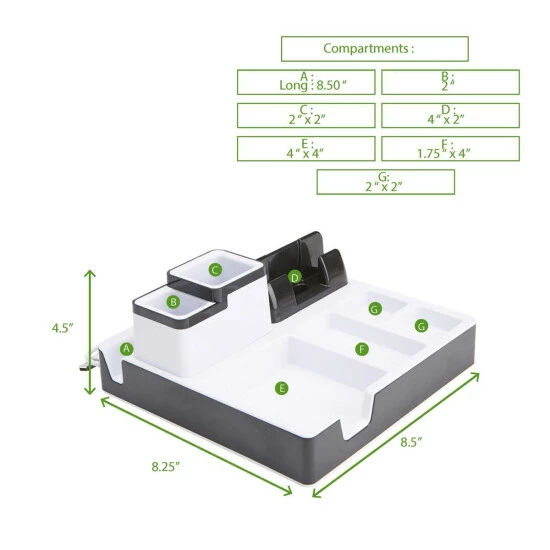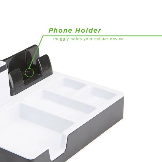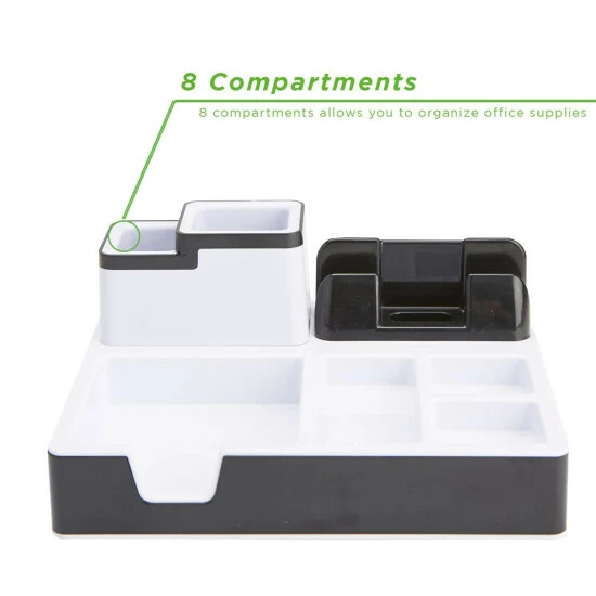 This desk organizer features a hand held portable charger for your iPhone charging wire and Samsung charging cables. Three inserts for USB cables and mini HDMI cables. Comes with eight storage compartments for storing smaller items like paper clips, erasers, staples, post its, hair ties, and much more.