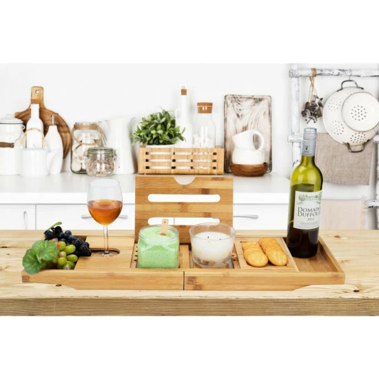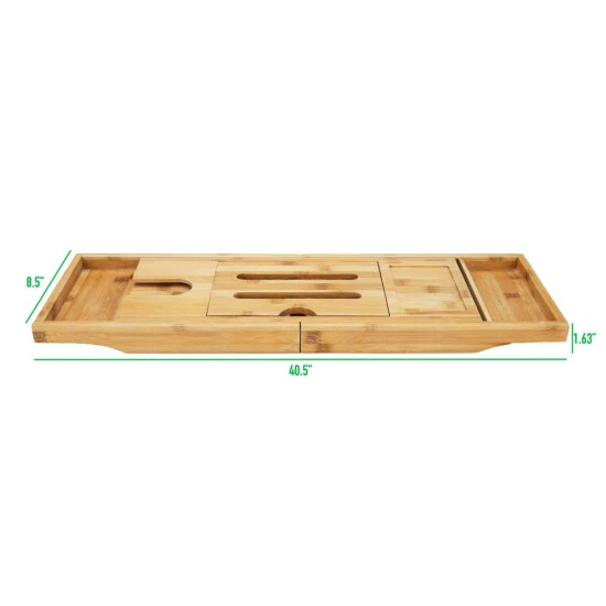 With a closed width of 27″, this ultimate bath caddy extends up to 40.5″ to comfortably rest across tubs of all sizes, so you can lay back and pamper yourself with some much-needed spa time at home. Crafted from 100% Bamboo, this resilient, eco-friendly bath caddy resists moisture, warping, and mildew, and provides a strong but lightweight caddy for your bath-time relaxation.